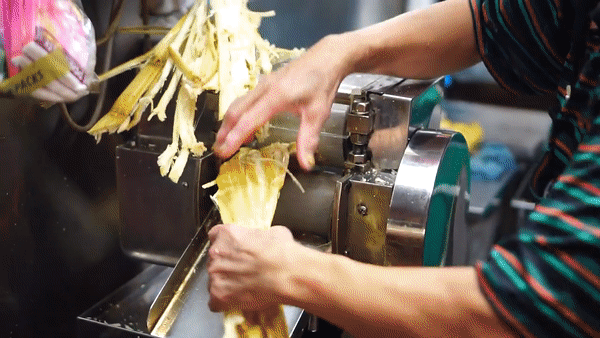 The sugar cane is passed between the rollers several times, each pass extracting more of the sugar cane juice, which is collected from a spout on the bottom. But we’re not done “chewing” yet!