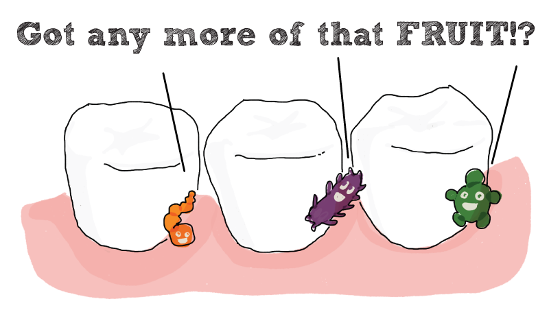 Remember how we talked about how the bacteria in your gut love the fiber of fresh fruit? Well, the bacteria in your mouth also love it, and because of fruit’s watery, fibrous nature, it’s all too easy to have some get stuck in between your teeth, where the bacteria will view it as a buffet line, eating and excreting acid which leads to tooth decay and dental caries.