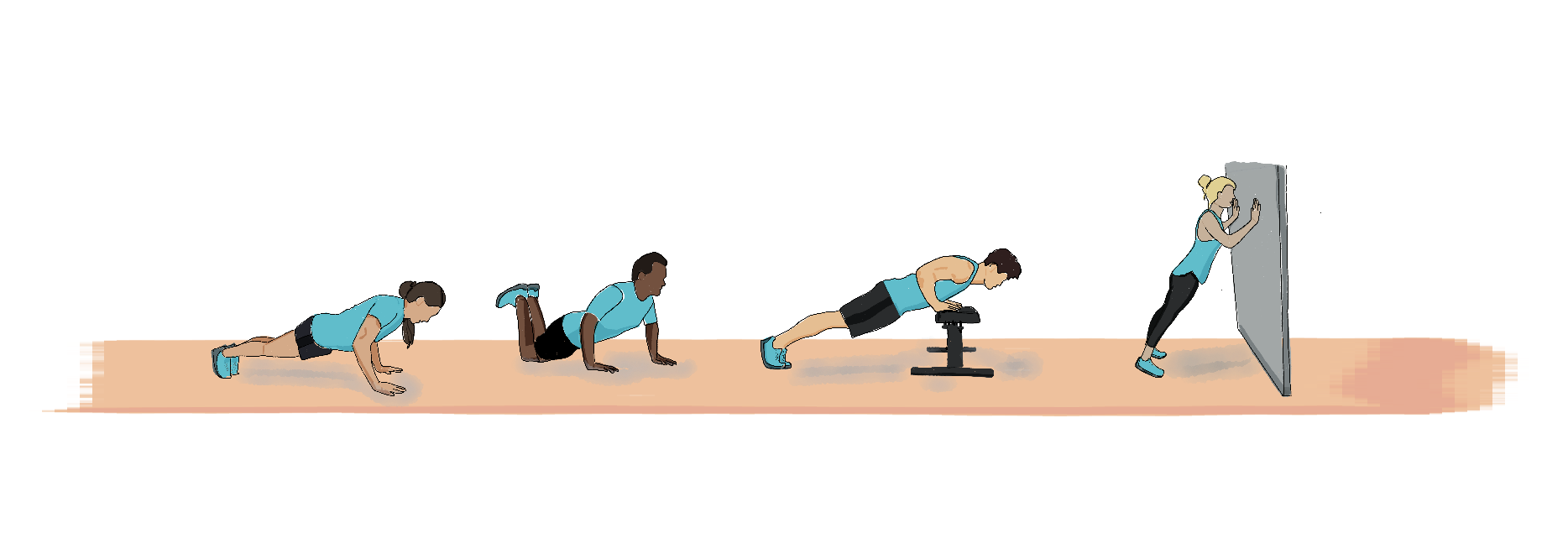 To figure out which one is right, find the hardest version that you can do 10 of in a row. If you’re on the borderline, for example you can do 8 with knees off the ground but can’t make the full 10, that’s close enough.