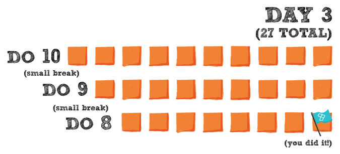 On Day 3, you do 10, short break, do 9, short break, and finish with 8 for a total of 27.